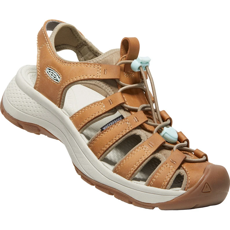 Die Astoria West Leather Sandale von Keen ist eine superkomfortable Outdoor-Sandale, die sich nah dem Wasser ebenso wohl fühlt wie im Alltag, und die mit nachhaltigen Materialien punktet.Die Sohle aus Aquagrip Rubber ist auch auf nassen Untergründen zuverlässig rutschfest und hinterlässt zudem keine Abriebspuren. Dank einer EVA-Zwischensohle, leicht erhöhter Ferse und einem Halt gebenden, konturierten Fußbett trägt sich die Sandale enorm bequem. Schnell trocknende Materialien machen sie bestens geeignet für den Einsatz nah dem Wasser, und die Eco Anti-Odor Behandlung reduziert schlechte Gerüche. Das Kordelsystem ermöglicht eine schnelle Anpassung an den Fuß, und die vorne geschlossene Kappe schützt die Zehen.Besonders cool: Das Obermaterial enthält recycelte PET-Flaschen, und das Kordelmaterial ist komplett daraus gefertigt.